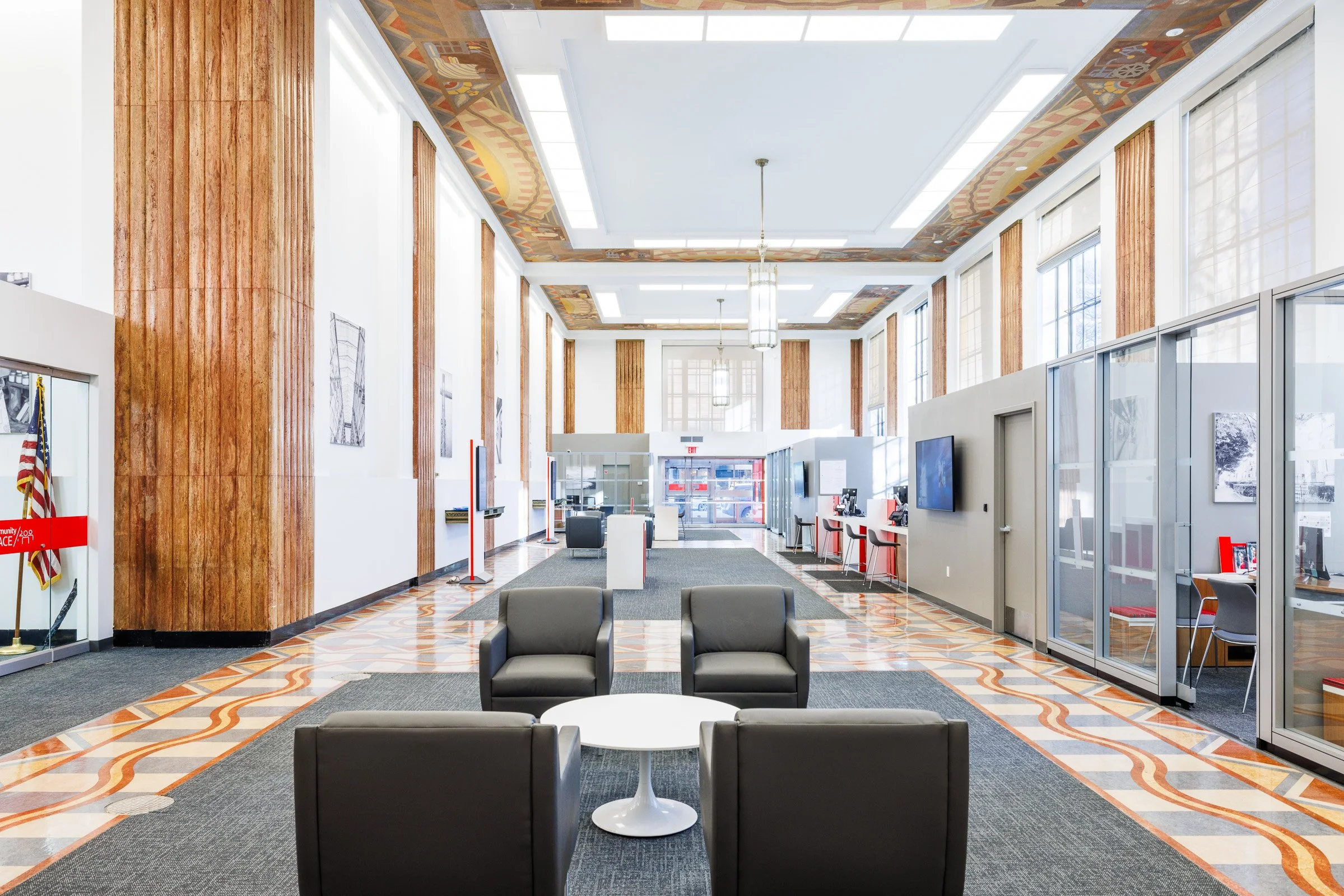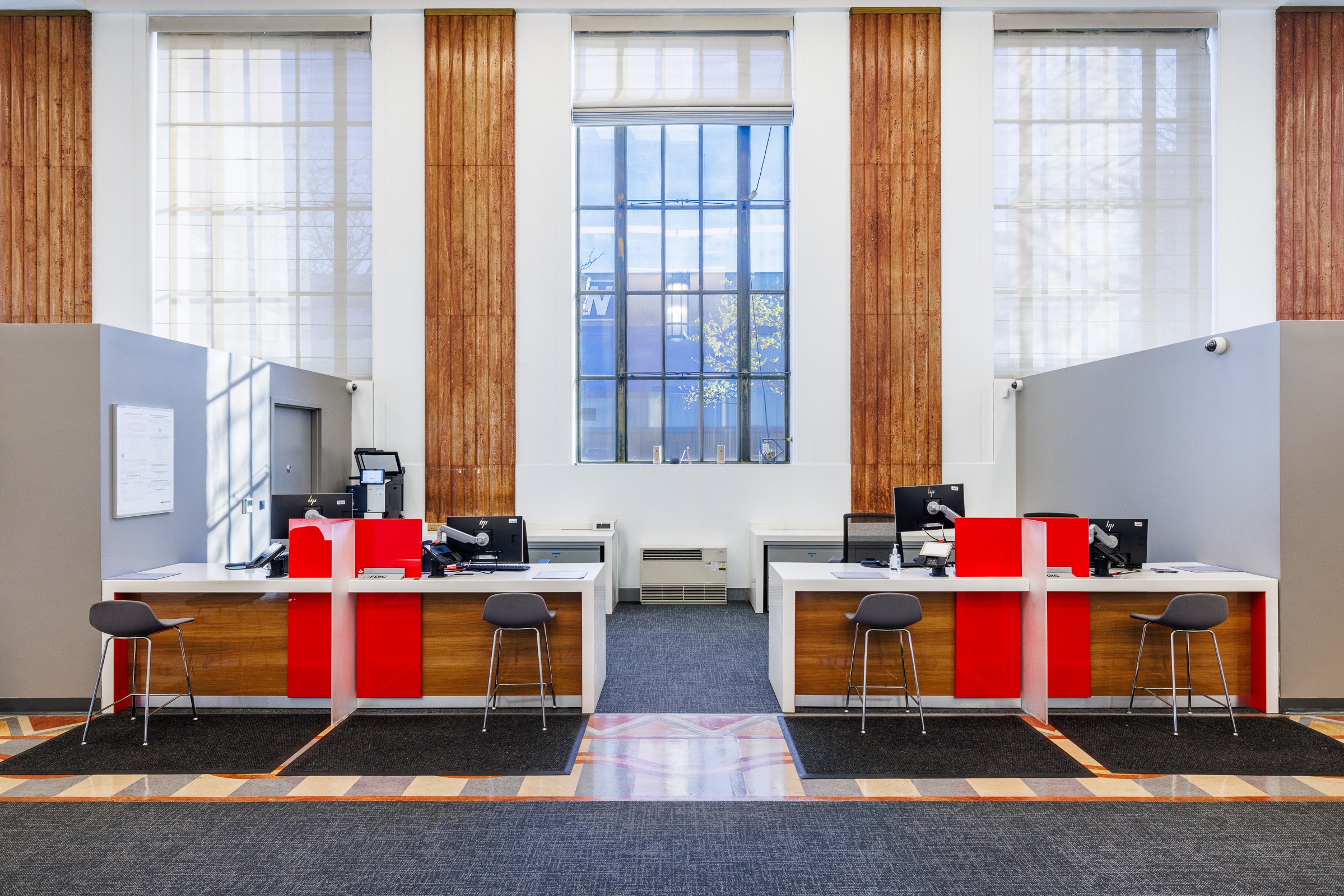 I have worked with Wade Ray many times, and the company has worked with many financial institutions, some in pop-up spaces and others in more permanent spaces like this bank. The construction wonderfully restrained the modern touches to allow space for the historic deco architecture to breathe and overwhelm its visitors with its beauty.